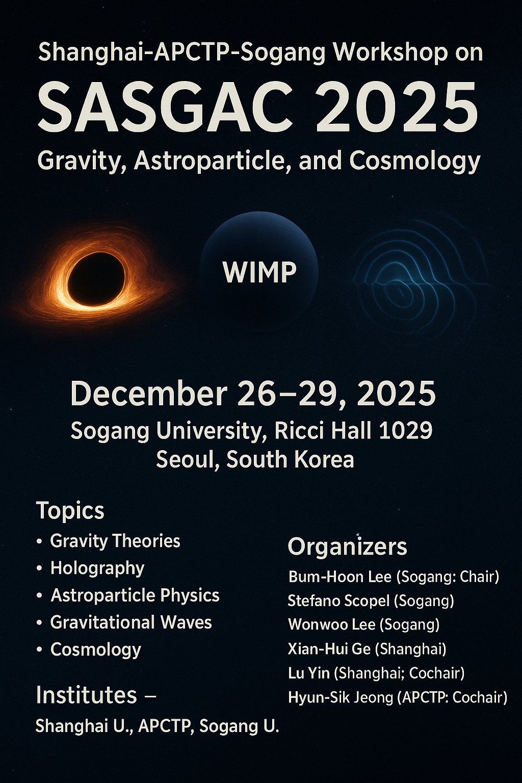 This four-day "Shanghai-APCTP-Sogang workshop on Gravity, Astroparticle, and Cosmology (SASGAC 2025)"is the first research activity, conducted in institutes in China and Korea, among others, such as the Theory Center at Shanghai University, the Center for Quantum SpaceTime (CQUeST) at Sogang University, and the Asis Pacific Center for Theoretical Physics (APCTP). The main topics will include gravity theories, holography, Astroparticle Physics, Gravitational Waves, and Cosmology. It is planned to initiate and enhance international collaboration, mainly among but not restricted to three institutes, in a relaxed atmosphere through the maximum discussion time, providing participants with knowledge and practical skills. The program will focus on interactions and discussions to maximise the opportunities for collaboration.