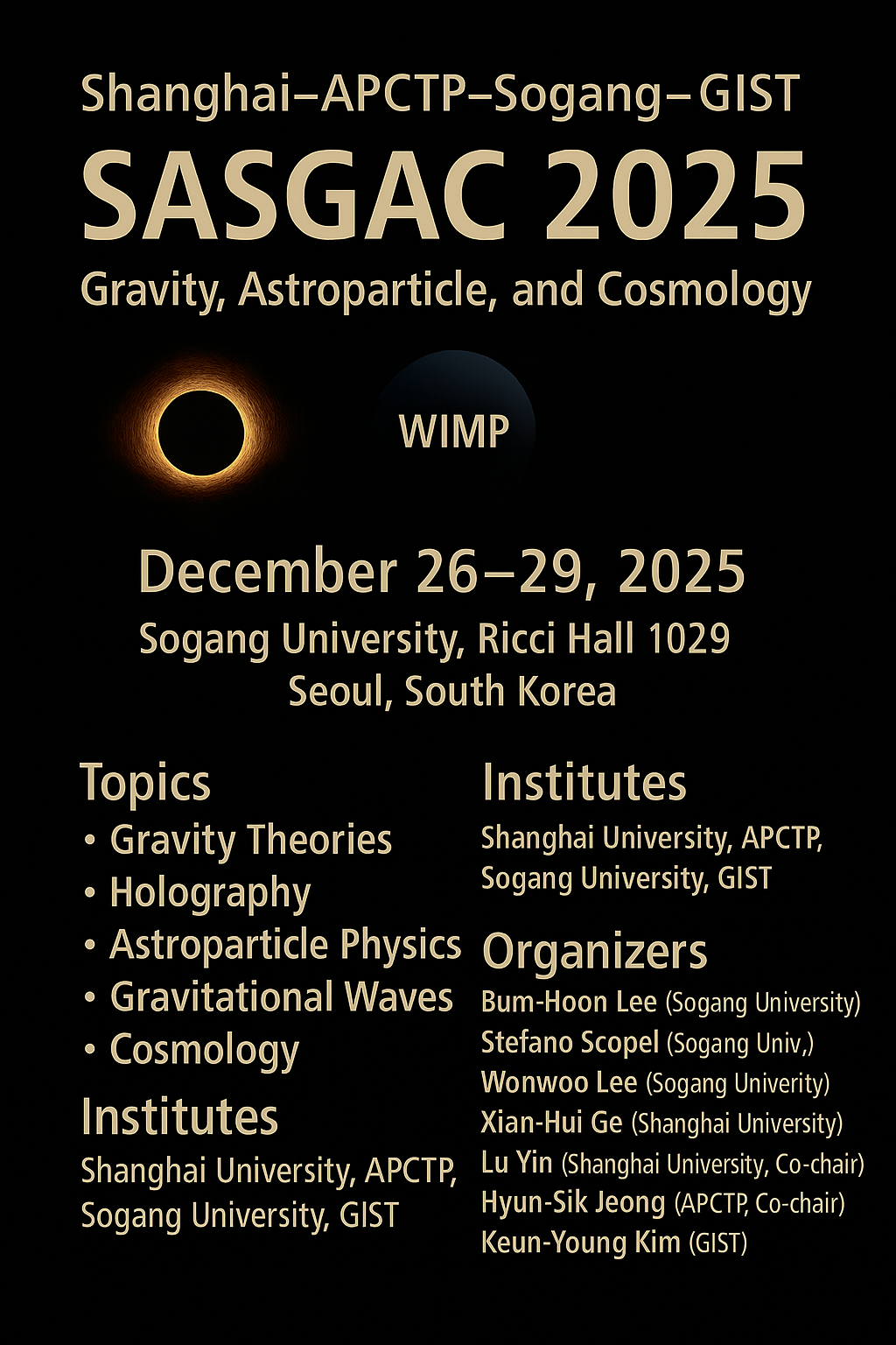 This four-day "Shanghai-APCTP-Sogang-GIST workshop on Gravity, Astroparticle, and Cosmology (SASGAC 2025)" is the first research activity, conducted in institutes in China and Korea, e.g.  the Theory Center at Shanghai University, the Center for Quantum SpaceTime (CQUeST) at Sogang University, GIST, and the Asis Pacific Center for Theoretical Physics (APCTP), among others. The main topics will include gravity theories, holography, Astroparticle Physics, Gravitational Waves, and Cosmology. It is planned to initiate and enhance international collaboration, mainly among but not restricted to three institutes, in a relaxed atmosphere through the maximum discussion time, providing participants with knowledge and practical skills. The program will focus on interactions and discussions to maximise the opportunities for collaboration.