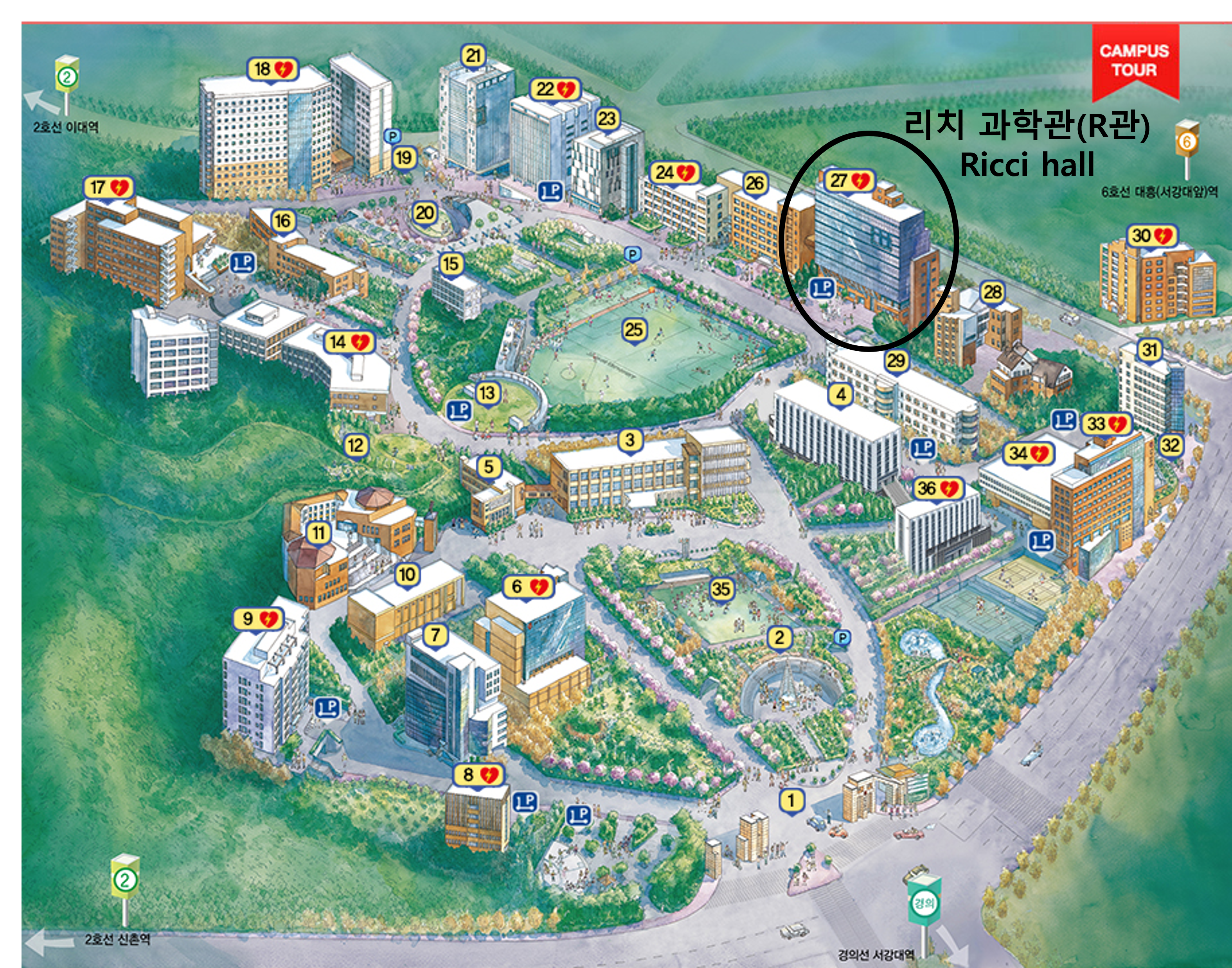 By Subway 1. Take the subway Line no. 9 from “Gimpo International Airport Station”.2. Transfer to the subway Line no. 2 at “Dangsan Station” and get off at “Sinchon Station”. 3. Take Exit no. 6 and walk straight for about 8 minutes and you will see the front gate of Sogang University. |